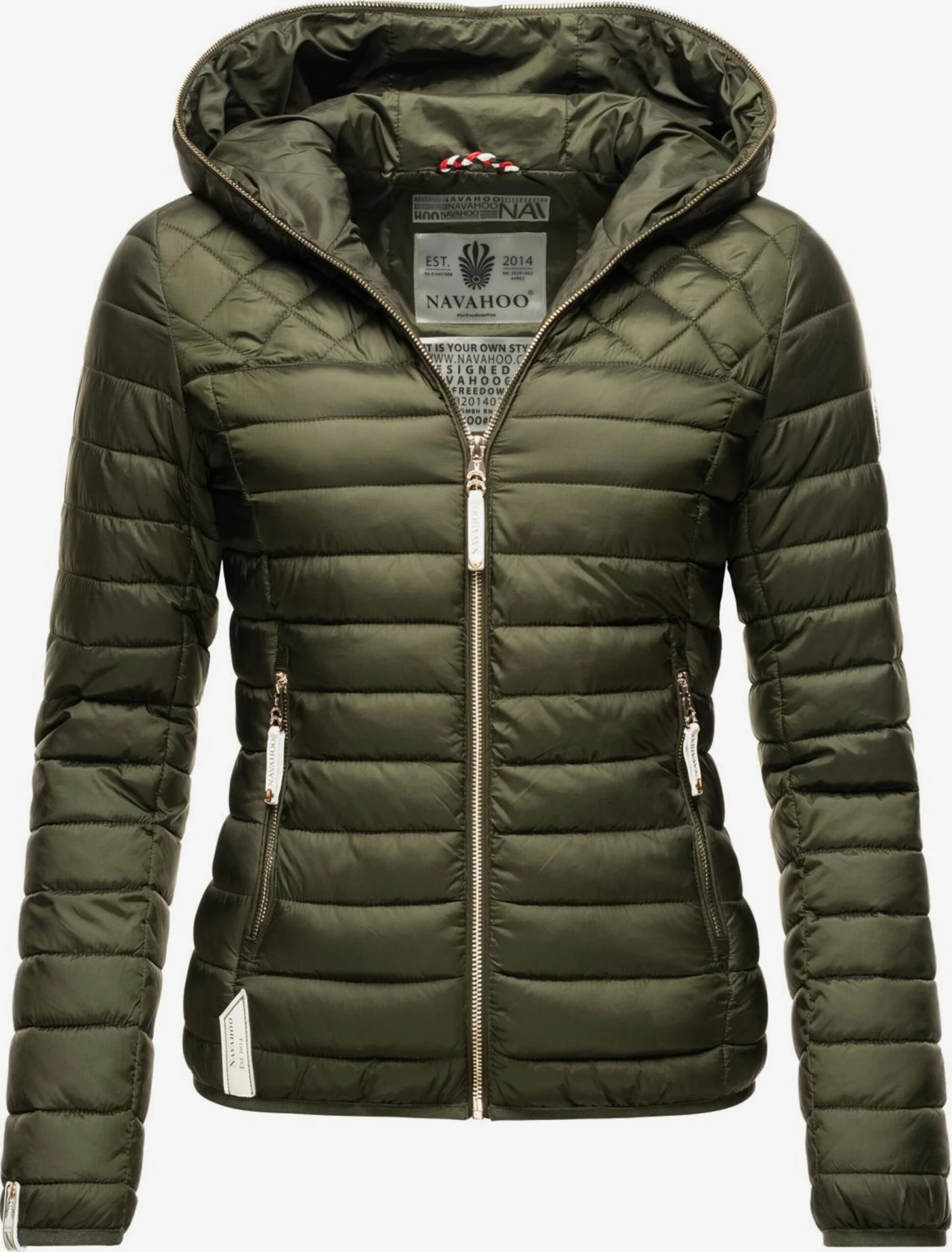 EnsfargetVattert jakkeElastisk linning/sømMed hetteSidelommer med glidelåsMerkelapp/etikettflaggGlatt stoffLett fôretGlidelås